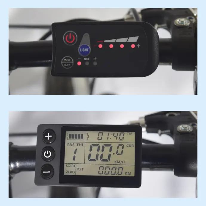 LCD: This screen has 5 assistance modes, battery charge indicator, real-time speedometer, travel time, odometer, voltage indicator and USB charger to connect your cell phone.