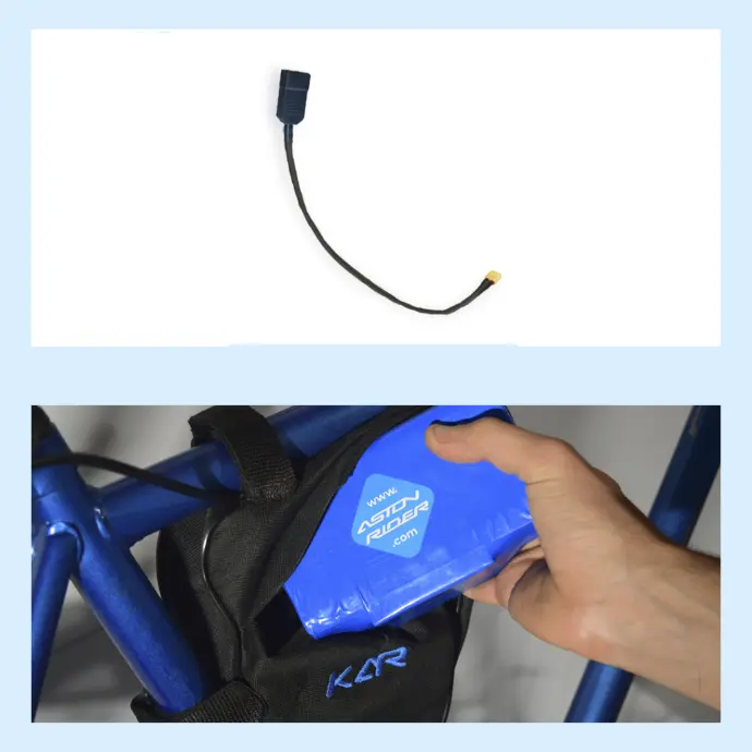Now it is easier to move with your KAR. You can load your kit anywhere. Just take the battery out of it and take it wherever you want. This external charging cable is the connector that links the charger cable to the standard plug on the removable battery.